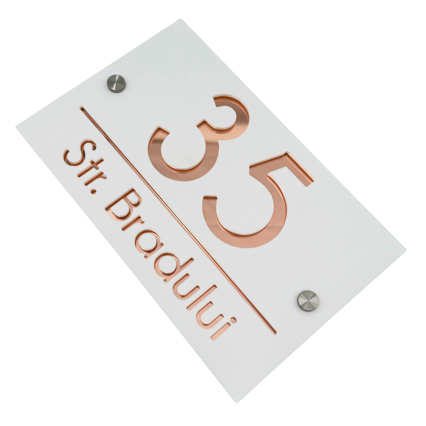 Premium house signs with number and address. Introducing our exclusive house number and address sign to the world of refinement and luxury. Crafted with care and attention to detail, this exceptional piece is a true work of art for your home. Our luxurious sign is made of the highest quality plexiglass, with a thickness of 6 mm, to provide you with unparalleled durability and strength. Each number and address is engraved with precision and care, to create an impressive and sophisticated visual effect. Choose our exclusive house number and address sign and turn your house or fence into a true work of art. With a luxurious design, this piece will add value and style to your home, reflecting your exceptional taste and personality.